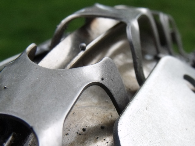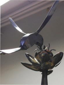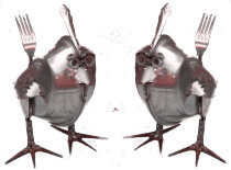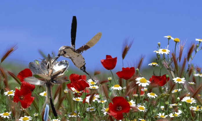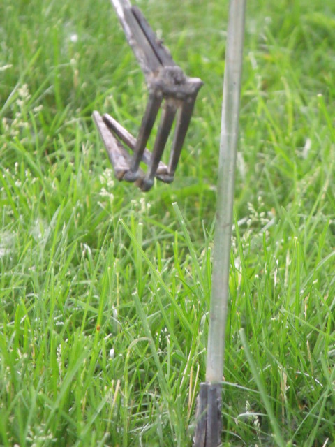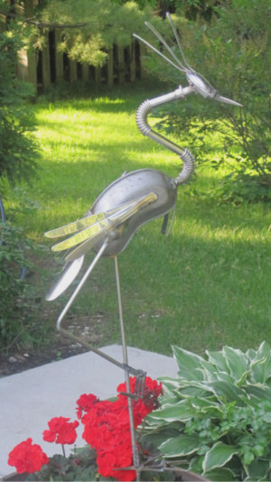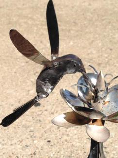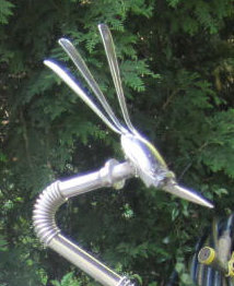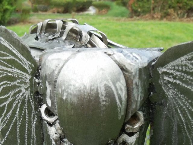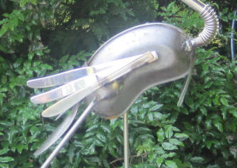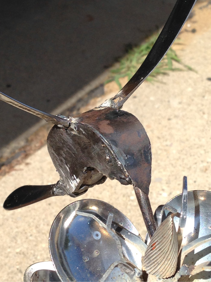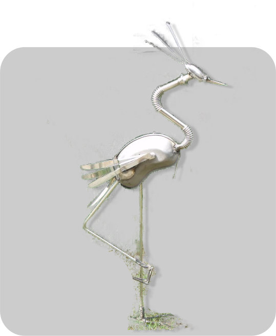 Although whimsical this piece has an element of grace or elegance to its form. This guy is the second in my birds line, the first entitled " Robobird" (below) came to fruition when I had completed the main body and talons (Fig. 3) of "Guardian" and I put the two together and VOILA the rest fell into place. Nothing elegant about this little guy he's just cute and pudgy. The wings (Fig. 1) of "Guardian" are table knives and I thought when they are stacked and staggered they looked like flight feathers and the head crest (Fig. 2) are stacked teaspoons welded to a pair of scissors which makes the beak. The neck is possible to conform to gaze at a particular point of reference in any garden.