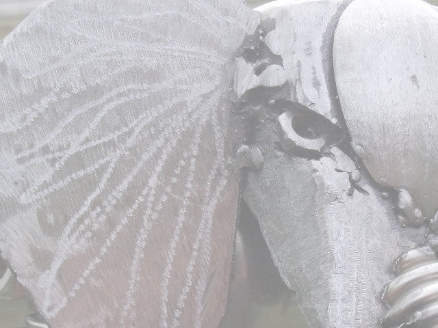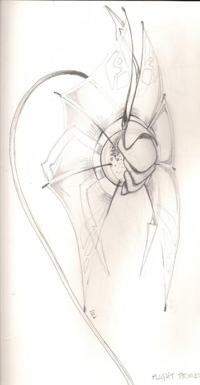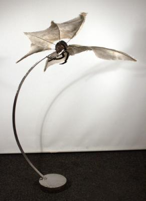 "Flight Primeval" was created after I came across an artist with incredible talent by the name of Benoit Poleche who's art can be seen at benalo.net. His grasp of nature transferred into metal is unparalleled. The sensual lines of something organic are still visible and very much alive in his art. I found it to be very inspiring. This piece had several welcome challenges one of which was the cutting and hand shaping of the articulated shell on the top of the piece. Another was working with a different medium such as textiles to bring lift and life to its form. It may appear somewhat basic and crude but when it took flight in my imagination for its time it was state of the art.